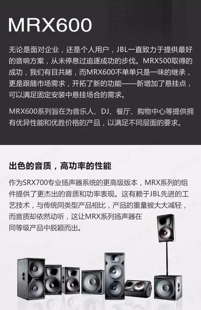 JBL MRX600系列專業(yè)音響旨在為音樂人、DJ、餐廳、購物中心等提供擁有優(yōu)異性能和優(yōu)勝價格的產(chǎn)品,以滿足不同層面的要求。