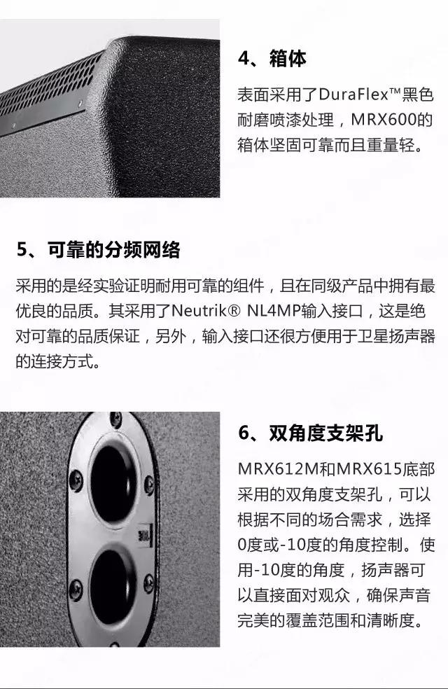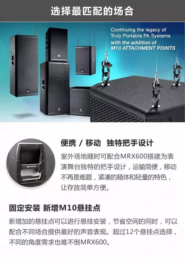 無論是面對企業(yè),還是個人用戶,JBL一直致力于提供最好的音響方案,從未停息過追逐成功的步伐。MRX500取得的成功,我們有目共睹,而MRX600不單單只是一味的繼承,更是跟隨市場需求,開拓了新的功能------新增加了懸掛點,可以滿足固定安裝中懸掛場合的需求。