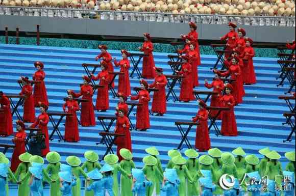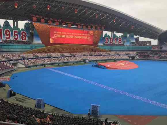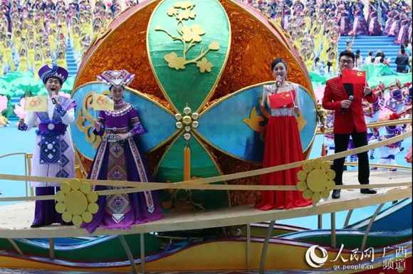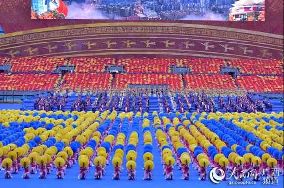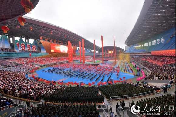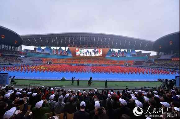 12月10日的南寧花團錦簇、喜氣盈城,處處洋溢著歡樂喜慶的節日氣氛。約2.2萬名身著盛裝的各族各界干部群眾,歡聚在廣西體育中心,共同慶祝盛大的日子。主席臺上方,用壯、漢兩種文字書寫著“廣西壯族自治區成立60周年慶祝大會”橫幅。表達了各族人民的共同心聲。“建設壯美廣西共圓復興夢想”12個大字高懸,兩側“1958”“2018”字樣格外醒目。