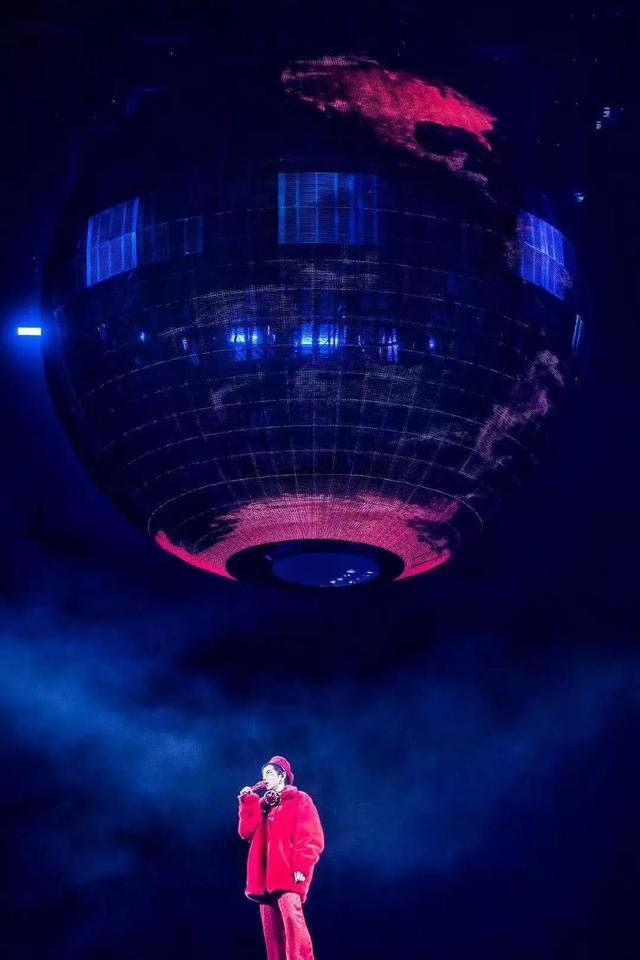 這顆“星球”是由雷凌顯示LED屏組成,整個球體直徑4m,懸掛于舞臺中央,契合“火星”主題,歌手演唱時,頭頂的LED球形屏幕上,視頻內容以顏色和運動結合的形式顯示,科技感十足。