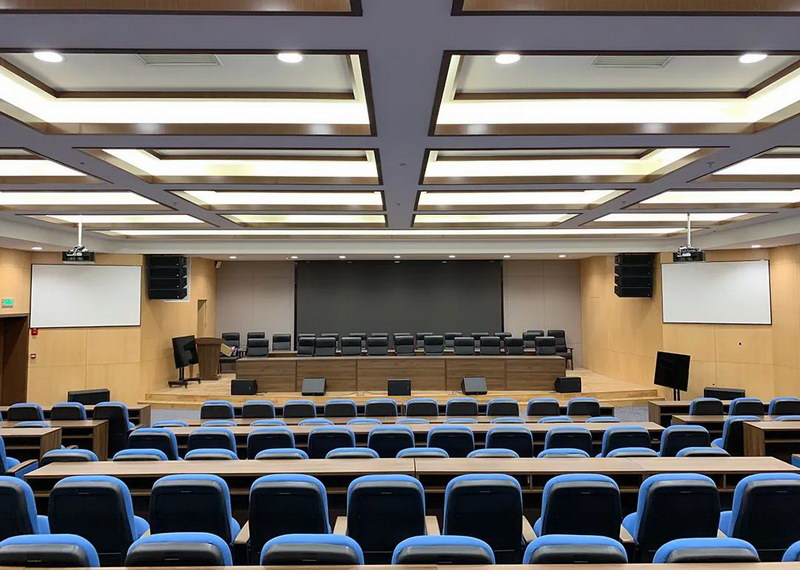 由于房間數量較多,根據每間的使用環境結合客戶需求及產品性能,最終為一層的學術報告廳、數字影像廳等共選用了20只C-208的8 "線性陣列音箱作為主擴聲系統,最大聲壓級高達135dB,所需的傾斜角度也擴張到了最大使用范圍,內部喇叭單元的安裝角度可滿足不同的場地使用需求,搭配C-15S的單15" 低頻音箱,該主擴系統安全穩定,操作簡易,系統結構更科學完善,是大型會議的品質之選。