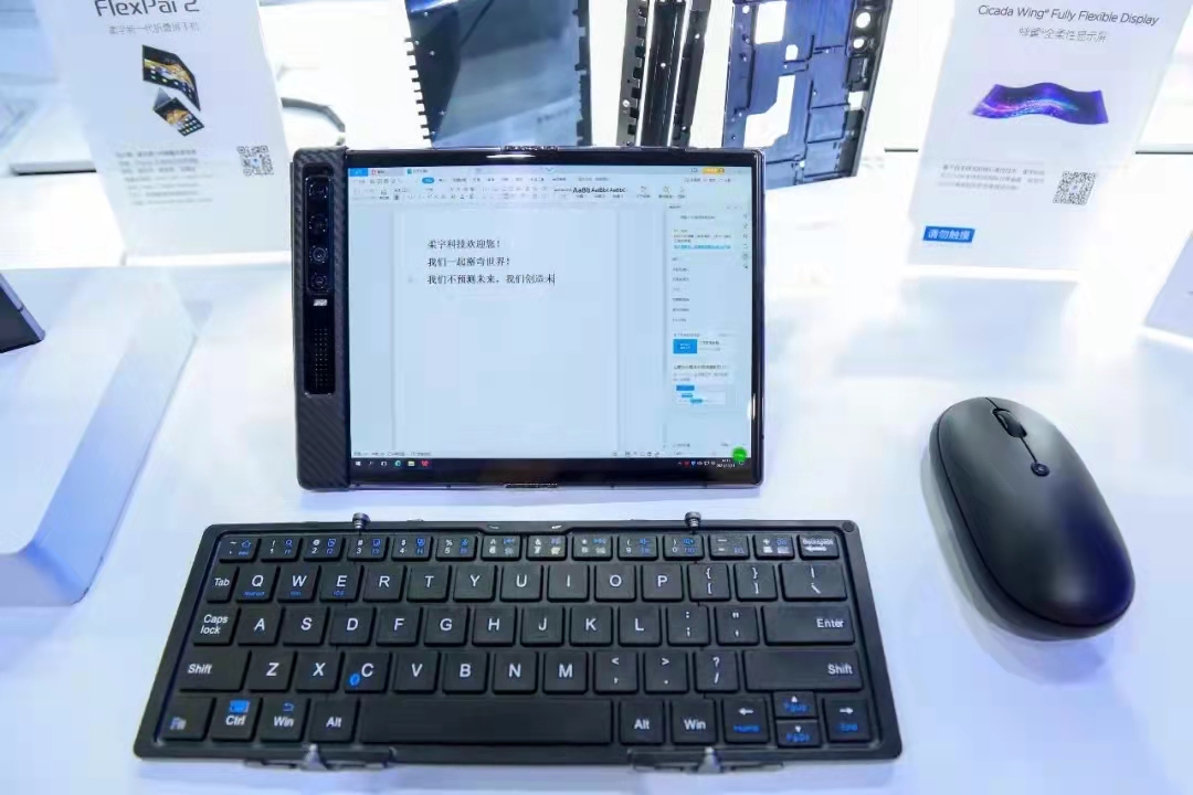 在博覽會現場,能夠看到柔宇帶來的眾多柔性電子創新產品:折疊屏手機FlexPai 2、智能手寫本RoWrite 2、RoMeeting智能會議銘牌系統、柔樹、柔性車載顯示解決方案等……吸引了眾多參觀者圍觀。
